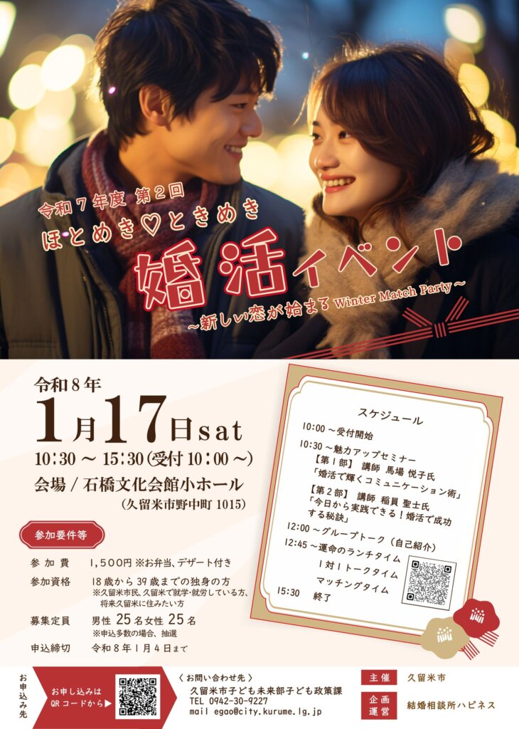 年明けの1月17日に婚活イベントを開催しまーす! 主催は久留米市さんで企画運営はハピネスなんです。楽しいイベントにしますのでたくさんのご参加お待ちしていま~す(^O^)/